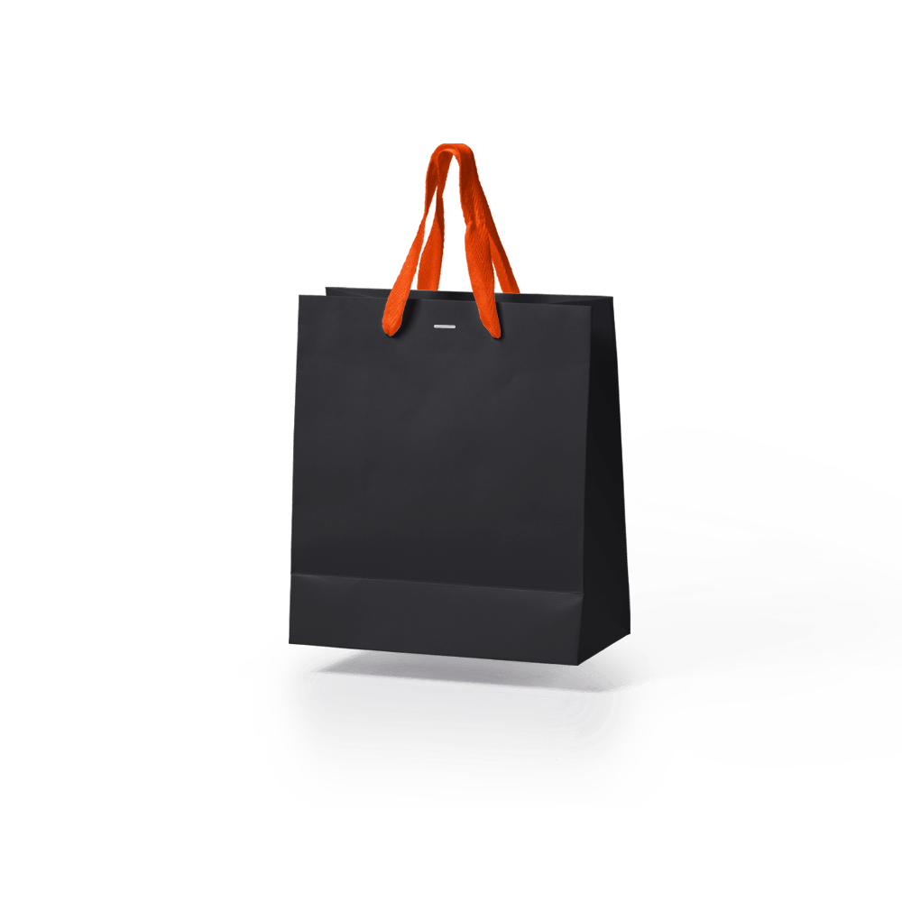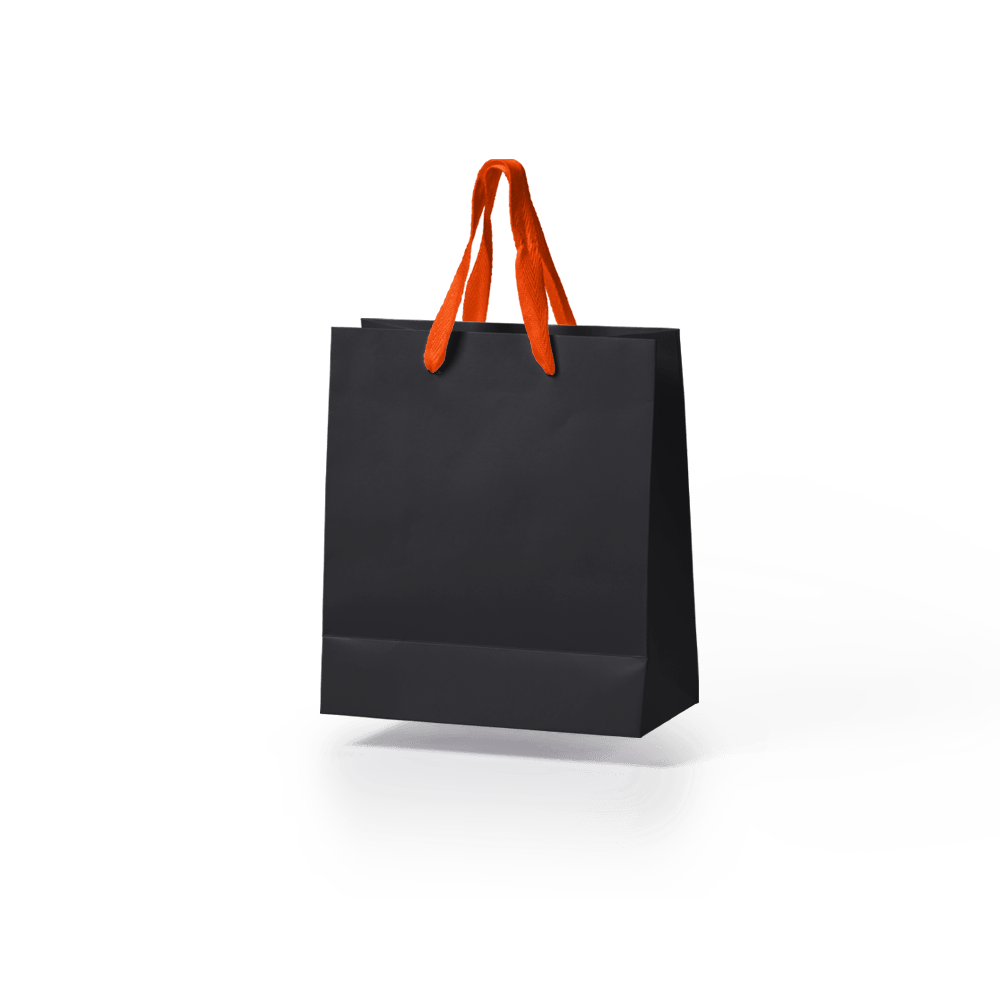 Sacola de papel kraft preta premium com alça gorgurão laranja tamanho "P" 17x15x7